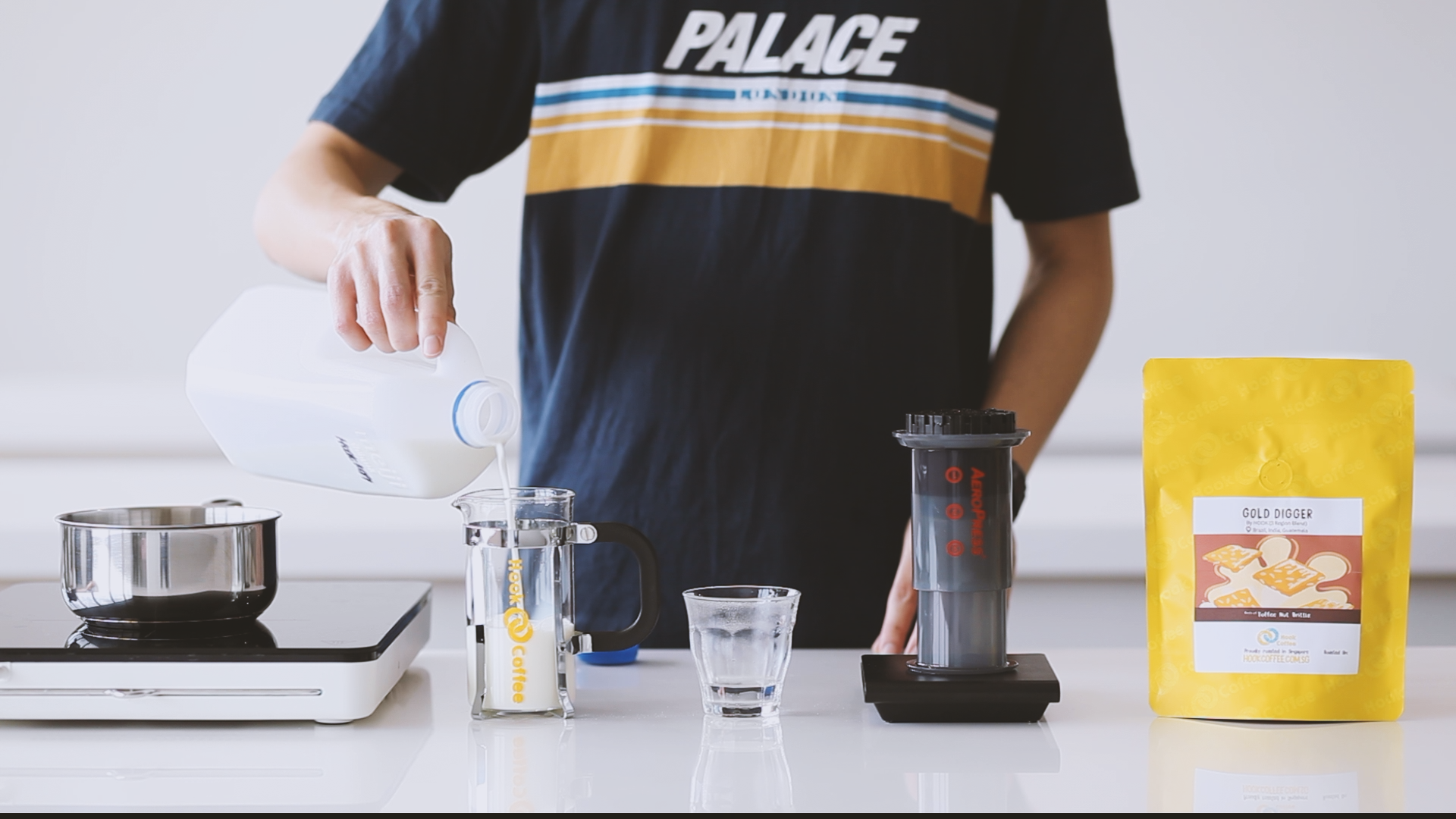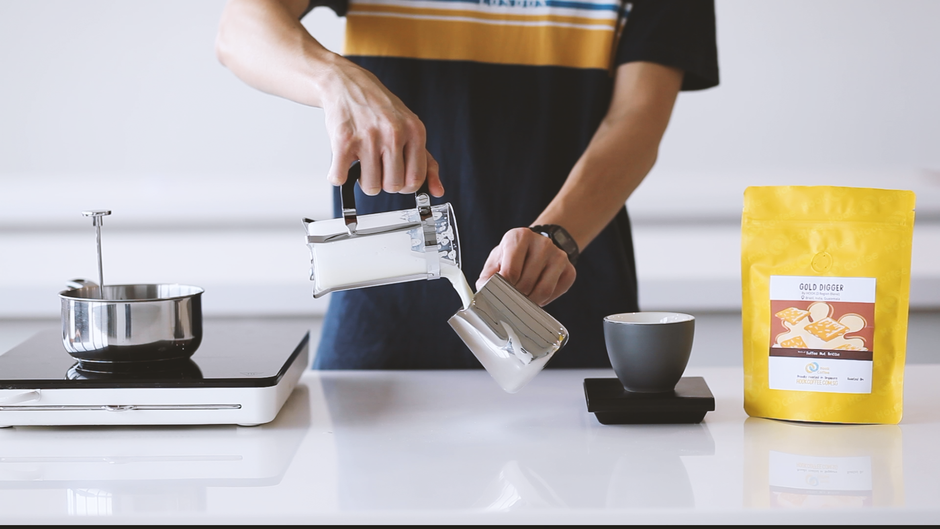 1. Grab some milk from your fridge, and heat it up till it reaches 60 degrees Celsius. This is crucial, as milk is at is best tasting between 60 to 62 degrees Celsius! We used our French Press as a measuring cup, filling it up with milk to its midpoint.