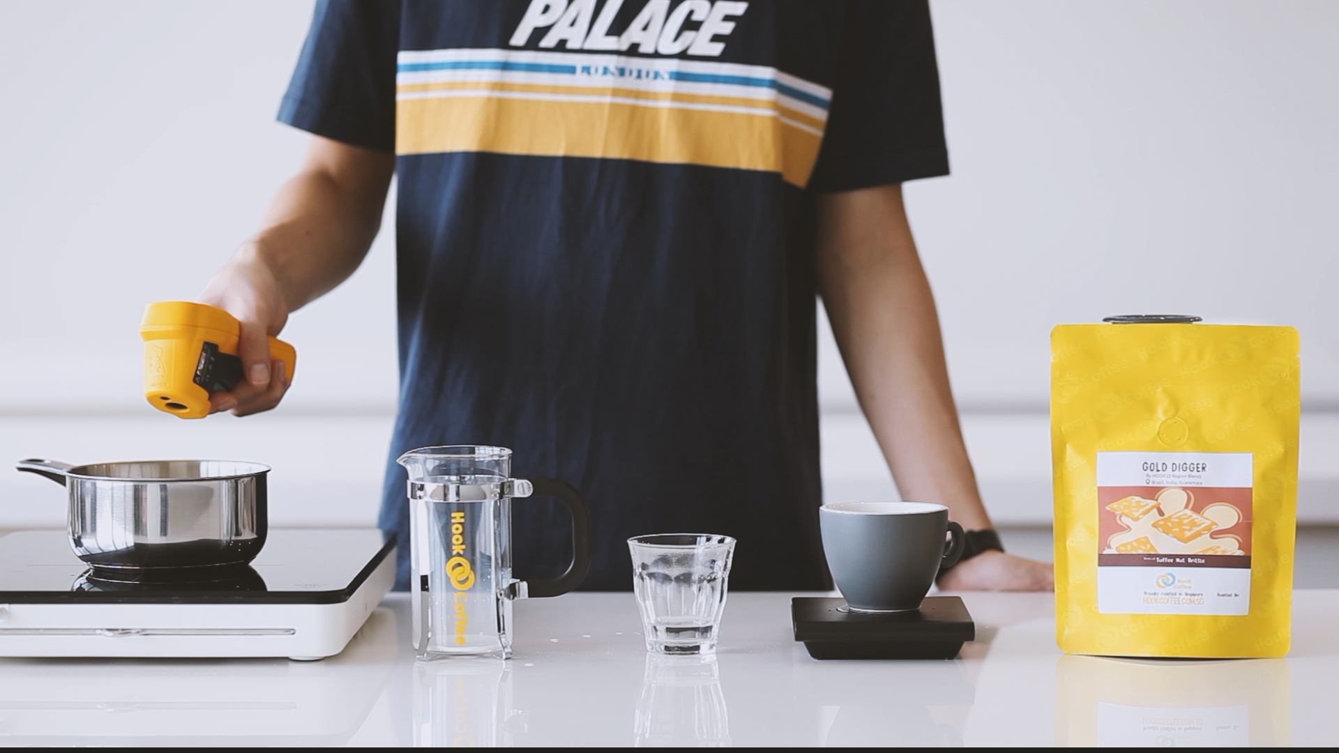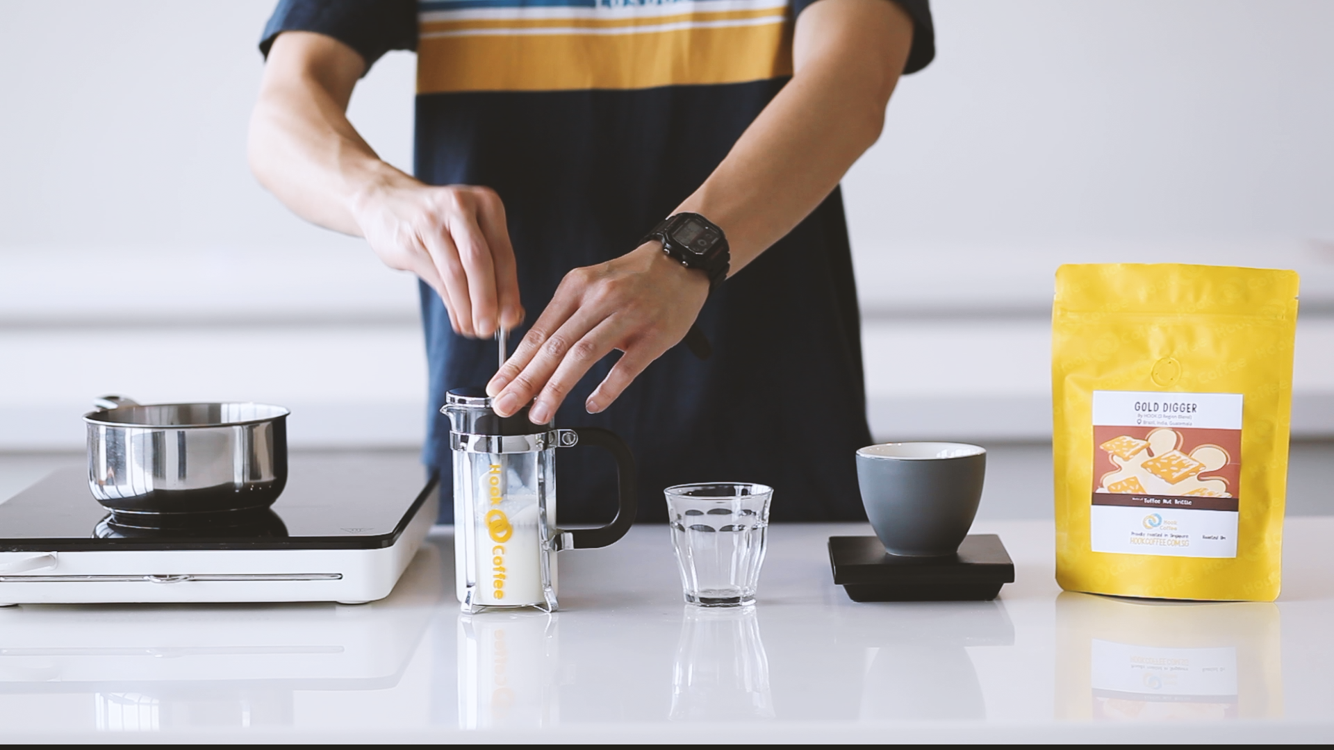 2. Set up the Aeropress by inserting the plunger into the brew chamber. We’ll be brewing with it in the inverted orientation. Prepare your scale, hot water and stirrer (p.s. – this comes with every Aeropress Go set). Place the Aeropress on the scale, dose your ground coffee, start the timer and begin adding 65g of water within 15 seconds.