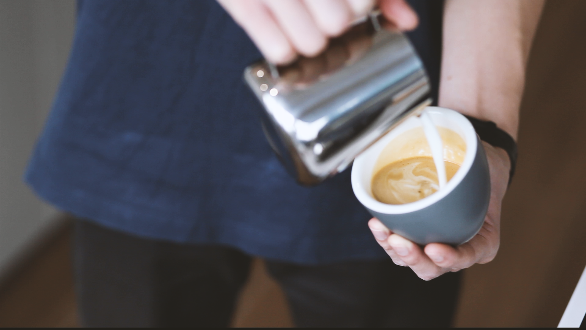 4. Grab a pre-heated milk pitcher. After transferring the frothed milk to the pitcher for some latte art, be sure to polish the milk! This involves tapping the base of the pitcher on a hard surface, popping any visible and big foam bubbles, and gently swirling the milk to incorporate it into homogenous, creamy milk ready for pouring. For a more in-depth tutorial, check out this video we made!