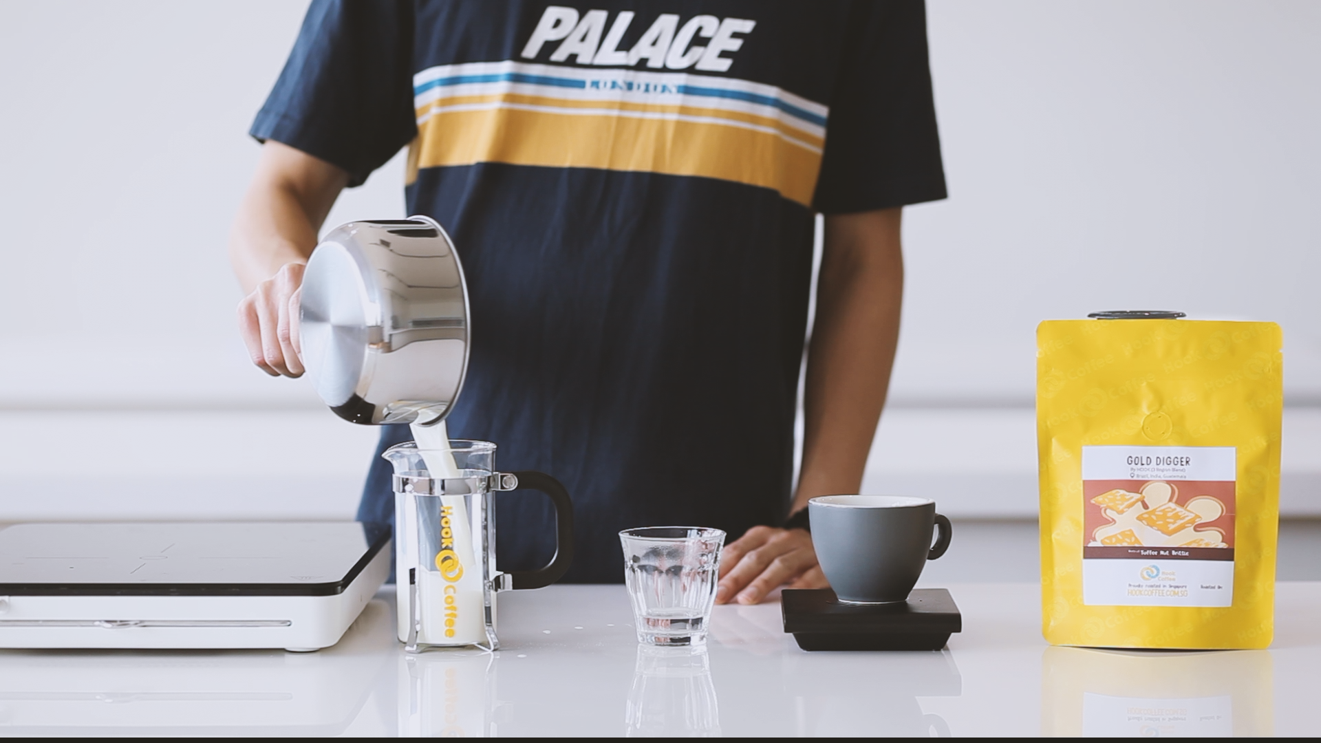 2. Set up the Aeropress by inserting the plunger into the brew chamber. We’ll be brewing with it in the inverted orientation. Prepare your scale, hot water and stirrer (p.s. – this comes with every Aeropress Go set). Place the Aeropress on the scale, dose your ground coffee, start the timer and begin adding 65g of water within 15 seconds.