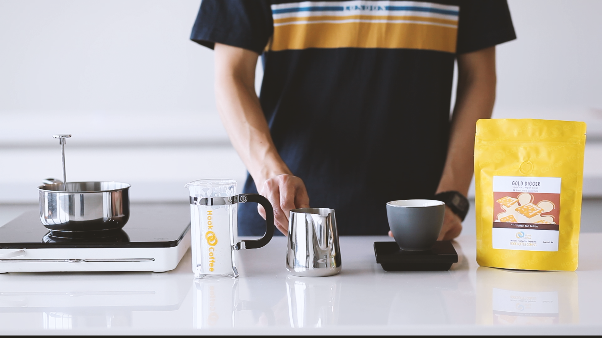 1. Grab some milk from your fridge, and heat it up till it reaches 60 degrees Celsius. This is crucial, as milk is at is best tasting between 60 to 62 degrees Celsius! We used our French Press as a measuring cup, filling it up with milk to its midpoint.